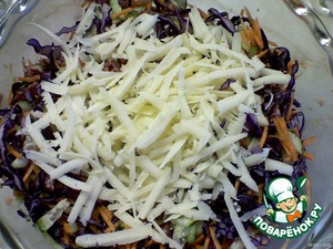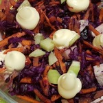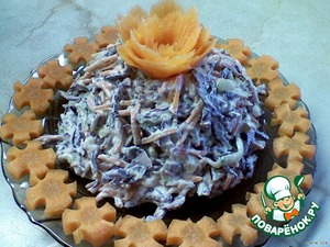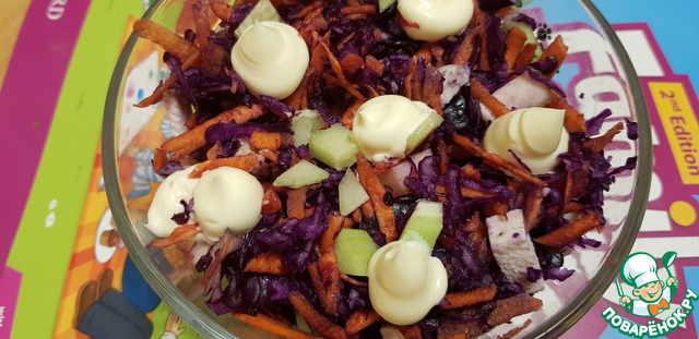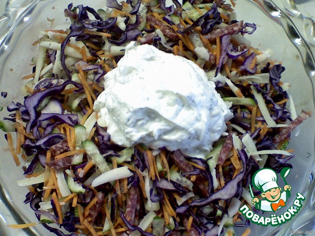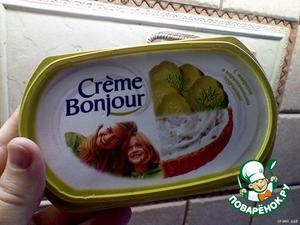 Отдельно смешать майонез и "Крем Бонжур" до однородной консистенции и добавить в салат.