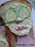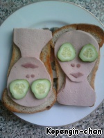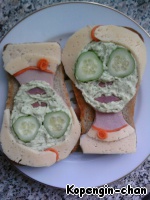 Вот таким нехитрым способом можно позабавить подруг и... напугать мужа, если нужно. Количество продуктов я не пишу, там всего по чуть-чуть надо. А вообще очень удобно делать этот бутерброд, когда готовишь "Оливье", кроме сыра в нем все есть. Так что не поленитесь и сделайте такую развеселую штуку! Идею наша в Интернете, только там это был бенто.