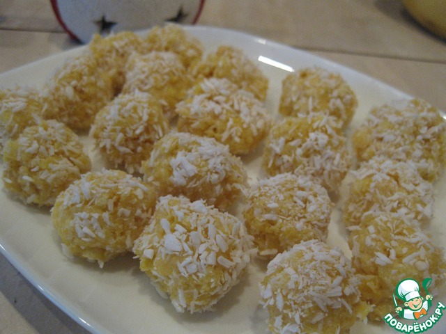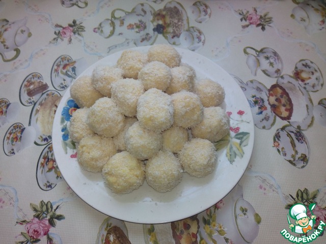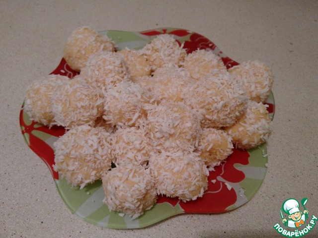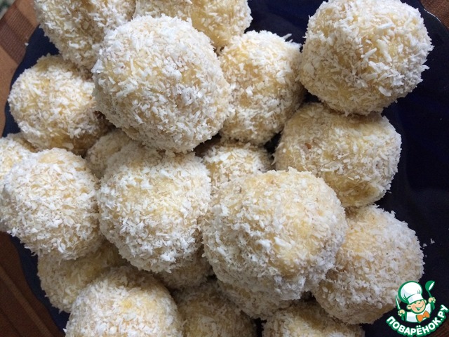 Все хорошо перемешать, слепить шарики и обвалять их в кокосовой стружке.