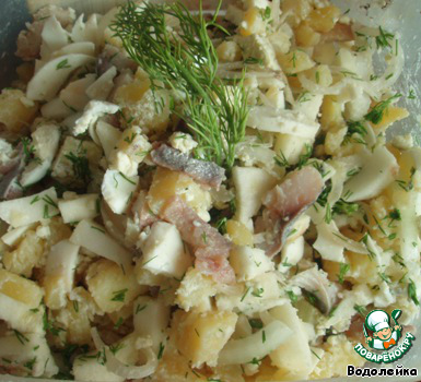 Перемешиваем овощи-фрукты и селёдку с заправкой и даём настояться.