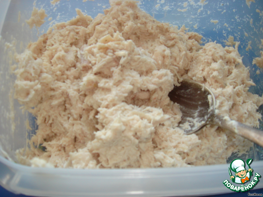 2. Смешиваем мясо с домашним майонезом (рецепт майонеза см. в моей кулинарной книге) и хреном.