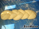 3. Разделить на три части и заплести косичку. Переложить косичку на смазанный маслом противень, накрыть и оставить "отдыхать" на 30 минут.