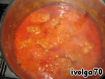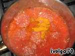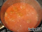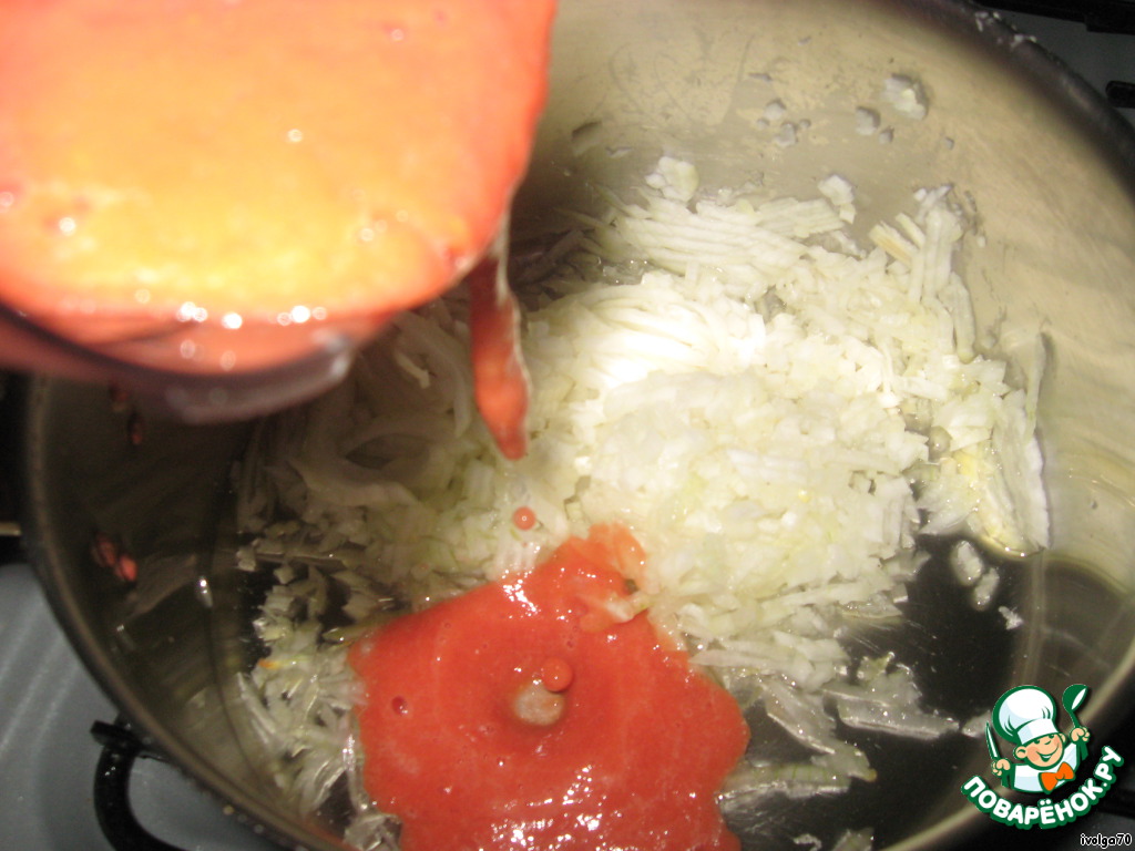 Лучок мелко режeм, вместе с маслом добавляем в кастрюлю. Томаты измельчаем в блендере и отправляем туда же.