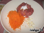 Берем наш фарш, соединяем с измельченным чесночком, потертой на мелкой терке морковью, приправки, соль. Тщательно перемешиваем.