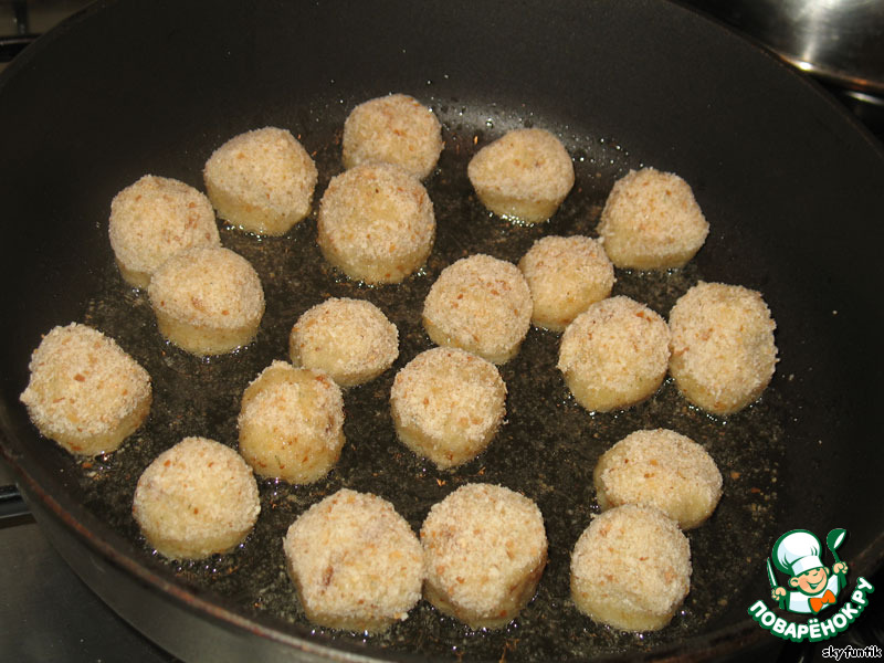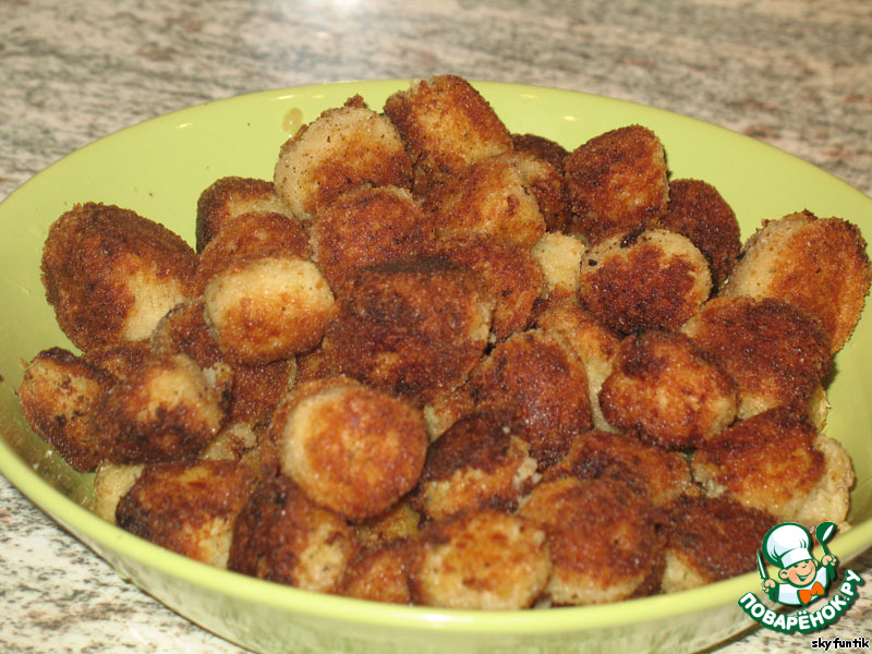 Скатываем из него маленькие шарики, обваливаем в сухарях.