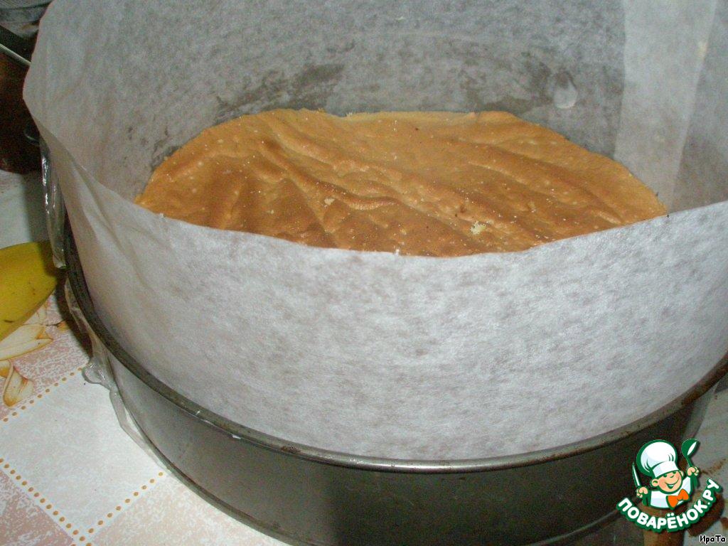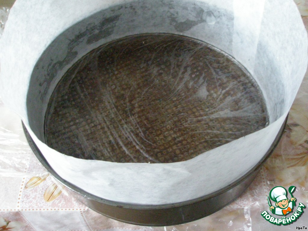 Вырезаю из бисквита круглые лепёшки и одну из них укладываю в подготовленную форму. А форму готовлю так: на поддон надеваю целлофан и закрепляю бортиком, внутреннюю часть бортика оборачиваю промасленной бумагой.