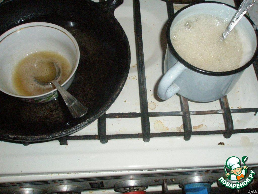 Готовлю сахарный сироп и одновременно растапливаю замоченный желатин. Капелька готового сиропа не должна растекаться на тарелке – это значит сироп готов.