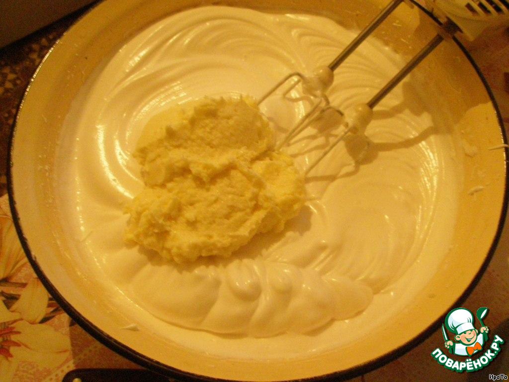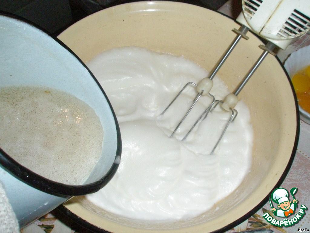 Взбиваю в пену белки и добавляю тонкой струйкой сироп и желатин. Продолжаю взбивать до полного остывания крема примерно 15 мин.