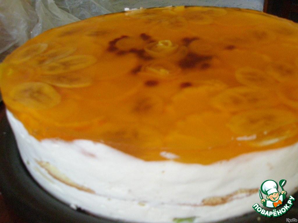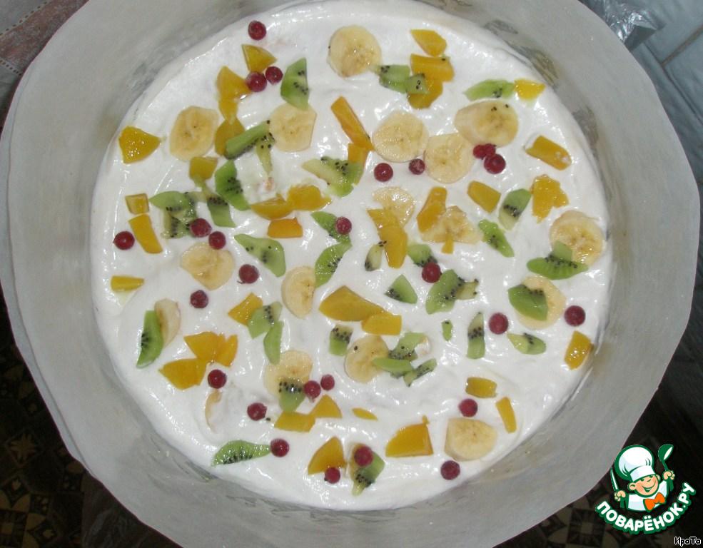 Пропитываю корж коньячным сиропом (сироп от персиков + 50 гр. коньяка) и смазываю небольшим количеством крема, стараясь покрыть все щели. Выкладываю половину нарезанных фруктов и заливаю половиной объёма крема. Накрываю второй частью бисквита, пропитываю и снова крем – фрукты – крем.Торт отправляю в холодильник на 40 мин.