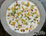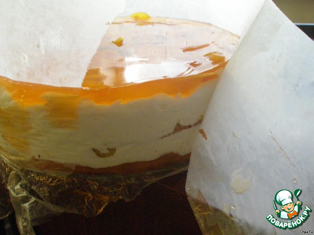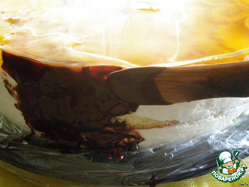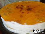 На застывшее суфле на торте выкладываю фрукты и в несколько приёмов заливаю желе. Заливка производится прямо в холодильнике через заварной чайник для чая. Очень удобно – фрукты не сдвигаются с места.