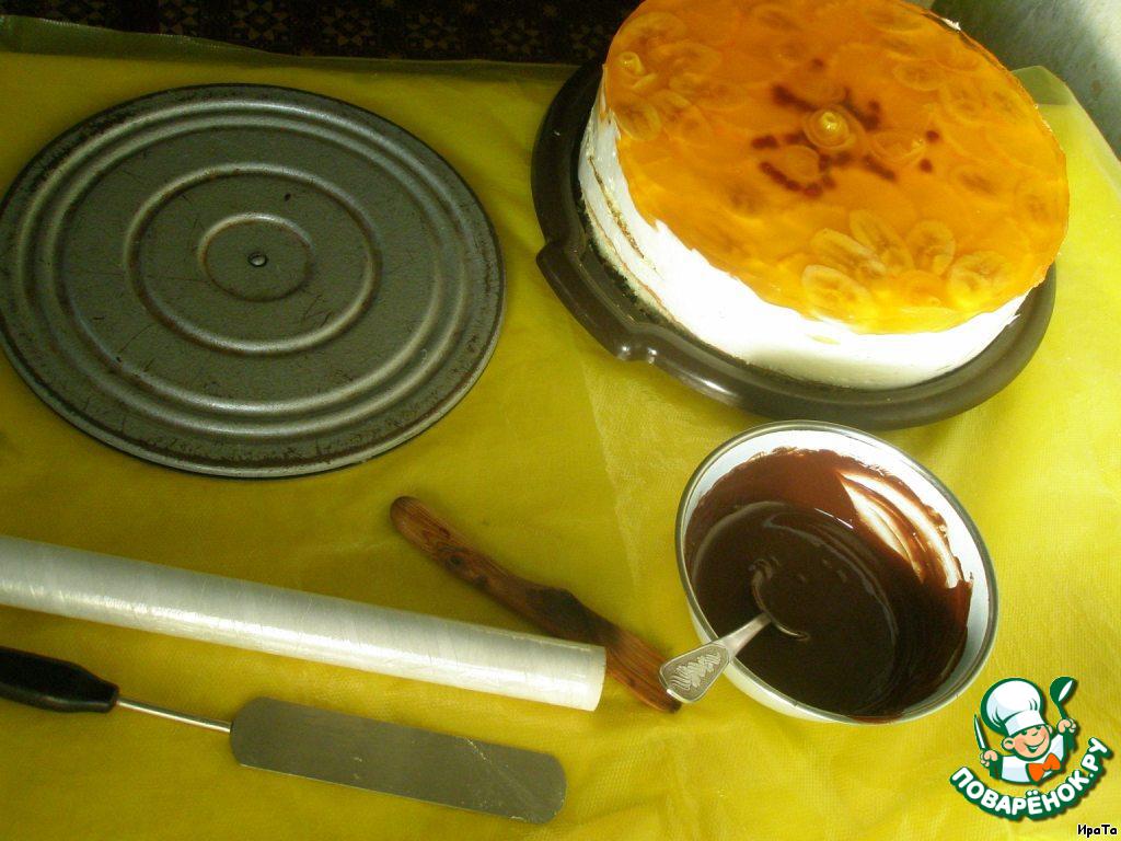 Для оформления торта удобно использовать диск для тренировки талии. Плёнкой липкой оборачиваю края подноса, чтобы не залить шоколадом.