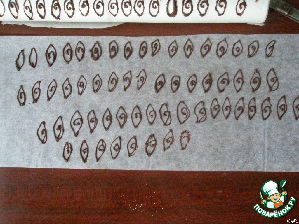 Из кондитерской глазури делаю кружева. Горячую глазурь наливаю в корнетик из пергамента и рисую очень быстро, иначе застынет. В холодильник класть не нужно, через 3-4 мин листочки легко отделяются от бумаги.