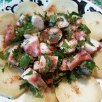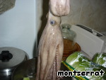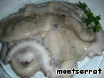 Дальнейшая участь красавца проста и бесхитростна: картофель варим в мундире, очищаем, нарезаем ломтиками на дно тарелки, сверху нарезаем (обязательно кухонными ножницами) кусочки щупалец осьминога, поливаем смесью оливкового масла и молотой паприки и теплым подаем к столу. Великолепная закуска! Такая форма подачи еще называется "Pulpo a la gallego" или осьминог по-галисийски (Галисия - самая западная провинция Испании, граничит с Португалией).