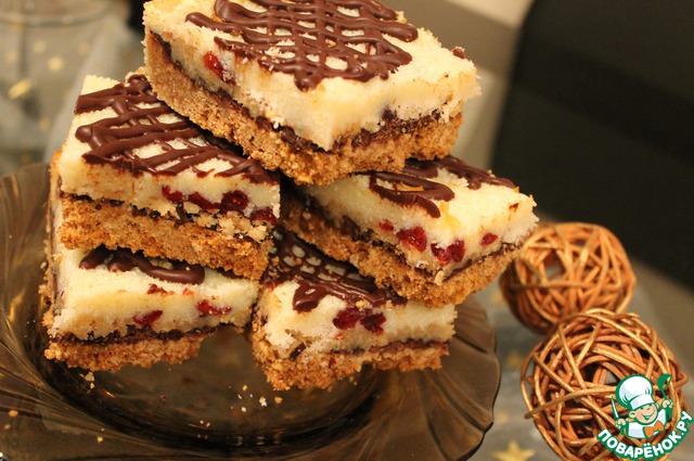 Это вкуснейшее пирожное, основа которого - рассыпчатое песочное тесто, тончайший слой шоколада, щедрая россыпь орехов с вишневыми цукатами и завершает это великолепие толстый слой кокосовой стружки, пропитанной сгущенным молоком. Позвольте себе маленькую слабость и, возможно, именно такая милая мелочь сделает Ваш день слаще!!! Рецепт Милы и мои изменения.