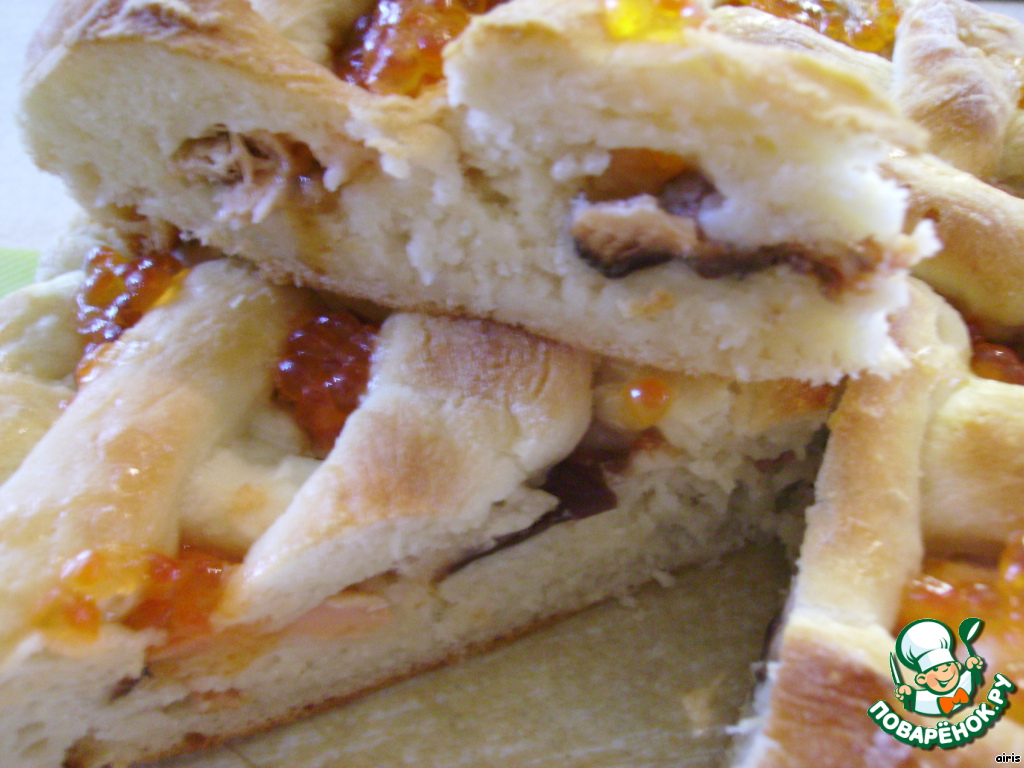 У меня пирог выпекался 25 мин. Когда он чуть-чуть остыл, украсила его красной икрой. Угощайтесь.