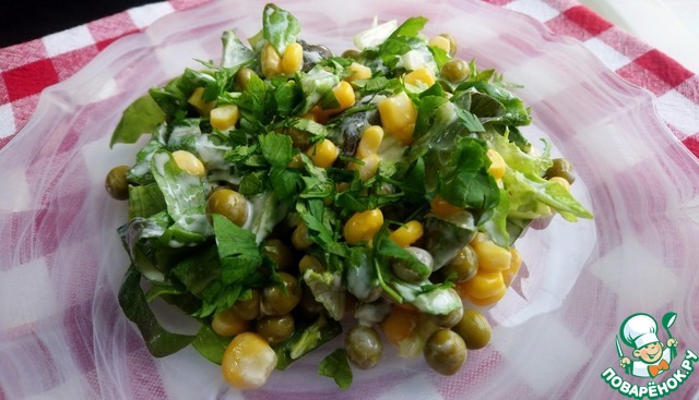 Режем капусту, добавляем кукурузу и горошек. Все заправляем майонезом!!!