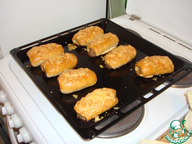 • Колбаски завернуть в тесто, кончики начинки должны быть видимы. Если тесто плохо клеится, смочить шов водой.