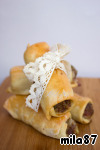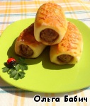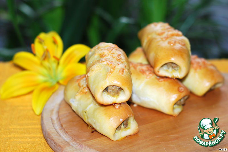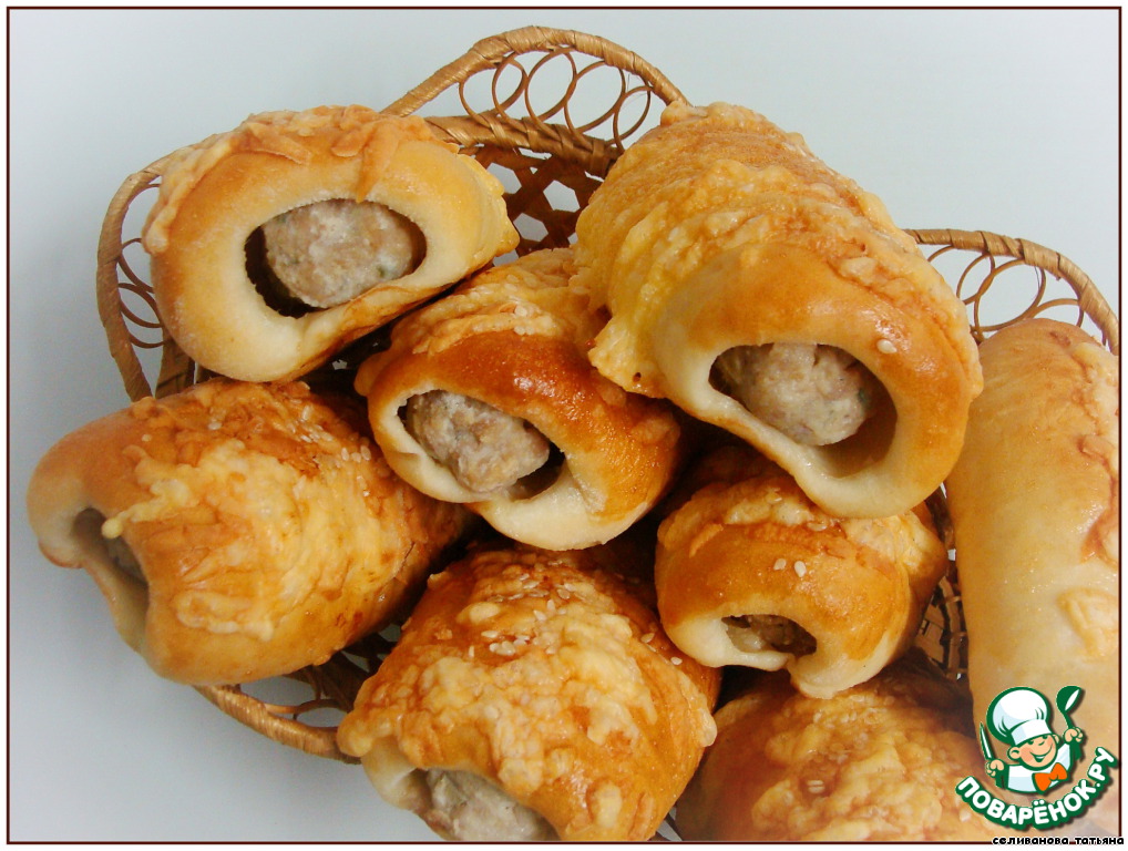 Колбаски завернуть в тесто, кончики начинки должны быть видимы. Если тесто плохо клеится, смочить шов водой.