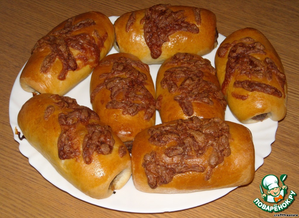 Пирожки смазать яйцом, посыпать тертым сыром.