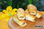 Тесто раскатать длинным пластом шириной в 10 см. Разрезать на 8 квадратов.