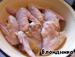 В глубокую посудину кладем крылья (предварительно промытые и обсушенные), добавляем к ним имбирь, примерно чайную ложку сухого чеснока, черный перец, солим.