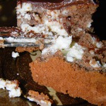 Взбиваем 4 яйца, масло, 0,5 стак. сахара. Добавляем кефир, муку, гашеную соду, соль, какао-порошок, все перемешиваем. Получается легкое, нежное тесто.