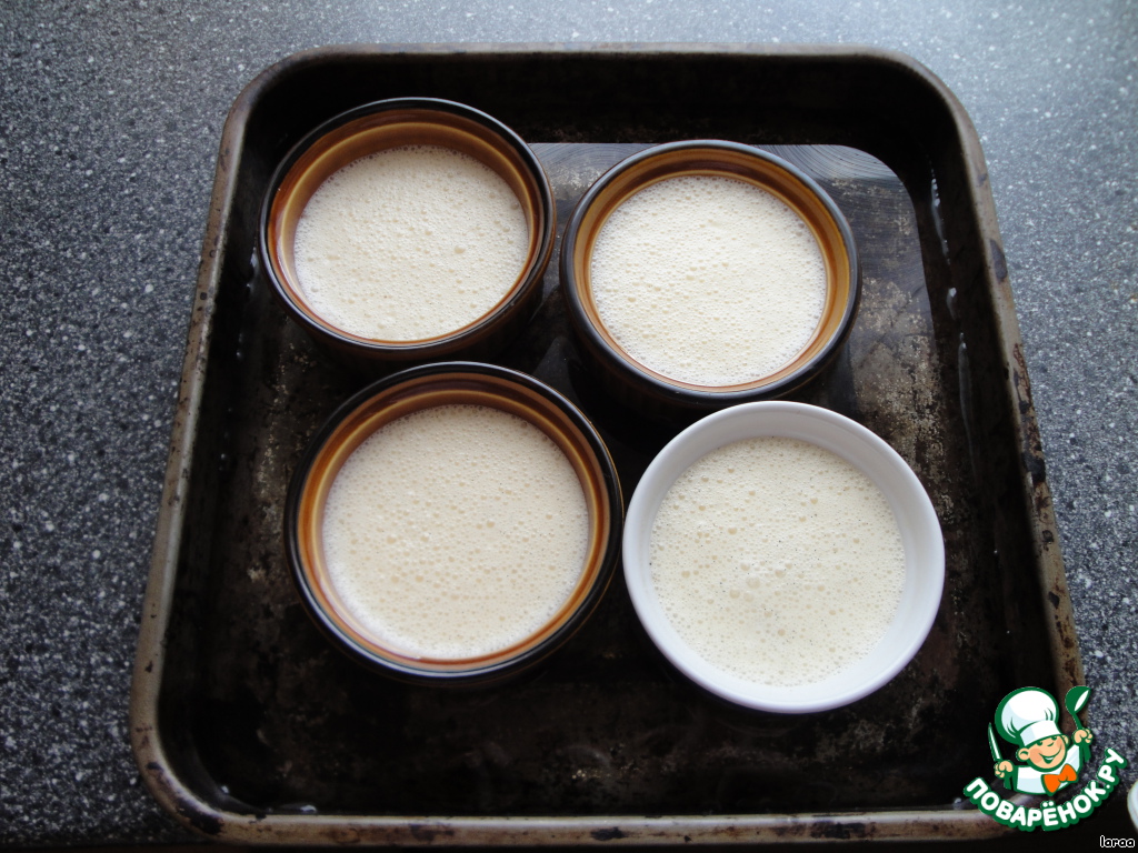 Для крем брюле все продукты перемешать, разлить в маленькие формочки и поставить в глубокий противень. Налить в противень воду и так поставить в духовку на 75 минут при 130 С.