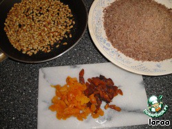 Орешки слегка обжарить без масла. Курагу мелко порезать, сливочное масло взбить с сахарной пудрой и ванилином. Затем добавить остальные ингредиенты.