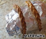Из теста сплел косичку (я подсказала немного) - ручку для корзинки и тоже в духовку (чтобы получилась форма ручки 1 литровую банку обернул фольгой и положил на нее косичку). -