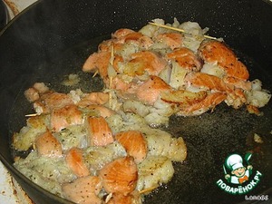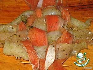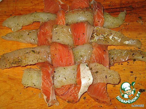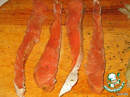 Филе двух видов рыб приправить специями и оставить на 1-2 часа в холодильнике. Далее нарезать на тонкие полоски.