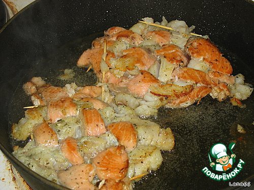 На сковороде разогреваем масло и обжариваем наши плетенки с двух сторон до золотистого цвета. Перед подачей на стол зубочистки осторожно вытащить.