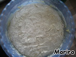 Постепенно добавляя смесь муки и дрожжей, замесить тесто. Тесто сверху присыпать мукой и поставить на 1,5-2 часа в холодильник.