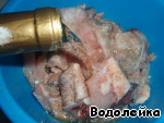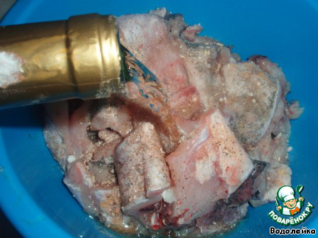 Мякоть отложить в сторону, а остальное (т.е скажем так кожу) солим, перчим, посыпаем приправами и заливаем вином (вина не много, не нужно что бы покрывало полностью). Перемешать и оставить пусть настаивается.