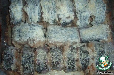 Теперь здесь я одну рыбу смазала майонезом и посыпала кунжутом, а вторую яичным белком (немного взбитым) и так же + кунжут. Ставим в духовку t примерно 180 и запекаем до готовности. У меня запекалась около часа (может минут 50), но тут все зависит от духовки.