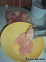 Теперь делаем фарш. Берем обрезанную мякоть (у меня ее получилось1.5 кг.и соответственно продукты все я указала с учетом этого веса) и пропускаем 2 раза через мясорубку вместе с размоченной булкой (или белым хлебом),чесноком (чеснока по вашему вкусу и желанию).