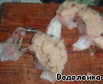 Теперь берем нашу кожу,сливаем вино и начинаем начинять вырезанные отверстия. Начиняем плотненько.