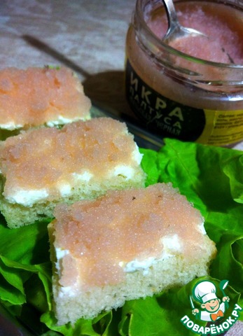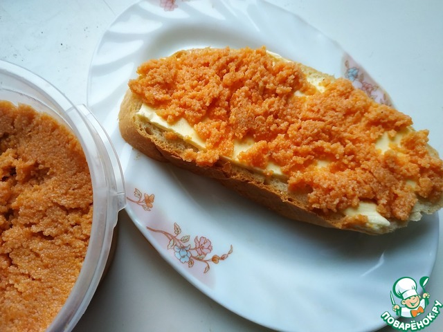И еще я сделала икорное масло. Просто взяла пачку масла мягкую и перемешала с икрой (ее я брала на "глаз"). Единственное, почему-то масло получилось небольшими комочками (но на вкус и поедание бутербродов с икорным маслом это никак не повлияло), миксером мешать не хотелось, побоялась, что икра превратиться в пюре, а перемешивала ложкой. Но, наверное, надо было масло растопить, остудить и потом смешать с икрой. В следующий раз так и сделаю.