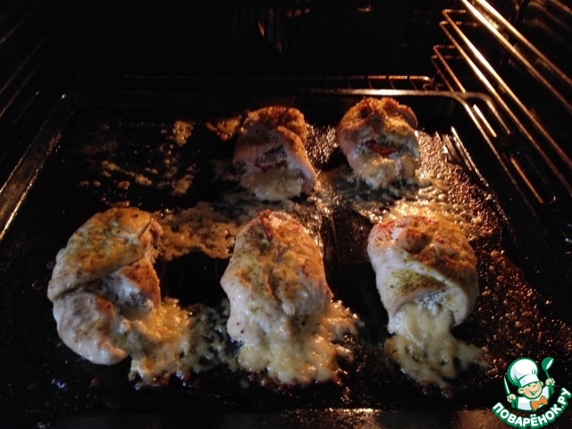 Филе разрезать вдоль, отбить слегка молоточком, посолить, смазать майонезом, положить внутрь кусочек сыра и помидора.