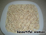 Первым слоем выкладываем на блюдо куриное филе, сетка из майонеза.