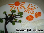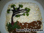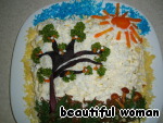 Можно оформить салат по-другому, вырезав ствол дерева из белокочанной капусты, получив при этом березку, на Ваше усмотрение.
