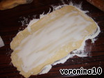 Через час тесто раскатываю в пласт толщиной 5 мм и размером около 10 х 30 см (теста хватает на 3 таких пласта), промазываю белковым кремом и сворачиваю в рулет.