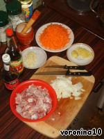 Морковь нарезать брусочками, лук, чеснок и имбирь мелкими кубиками. -