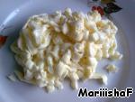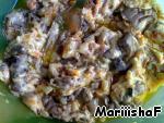 Плавленый сыр натираем на крупной терке (предварительно я его подморозила в морозилке). Грибы измельчаем и обжариваем на растительном масле, у меня грибы были дом.заготовки.