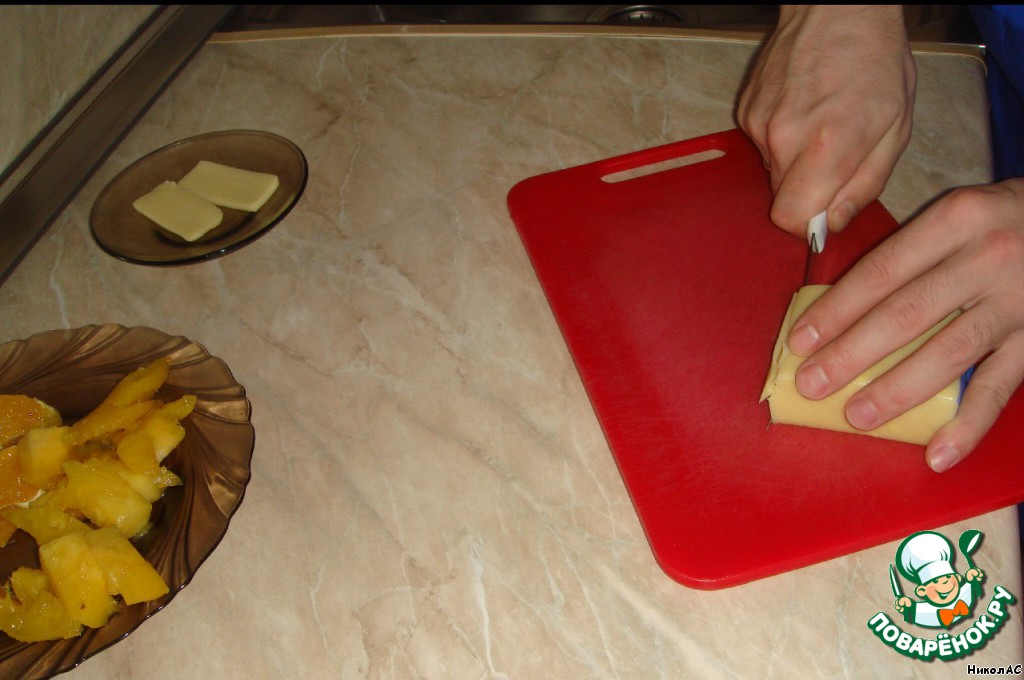 Ломтиками нарезаем сыр. -