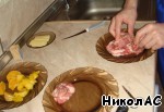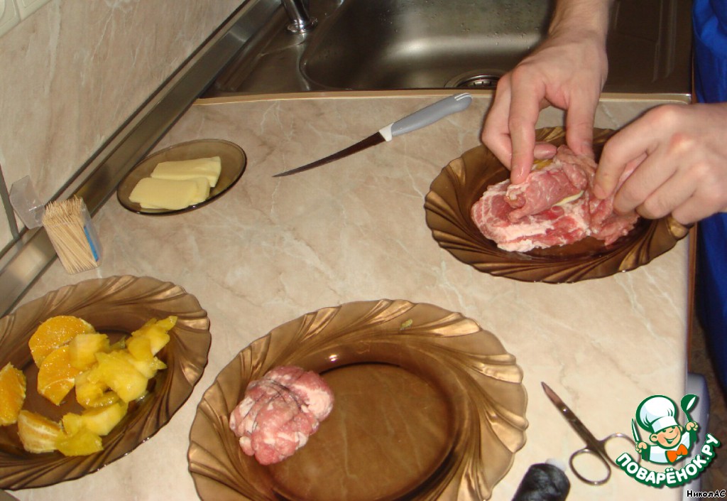 На отбивную кладем два кусочка одного из фруктов и заворачиваем их.