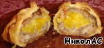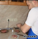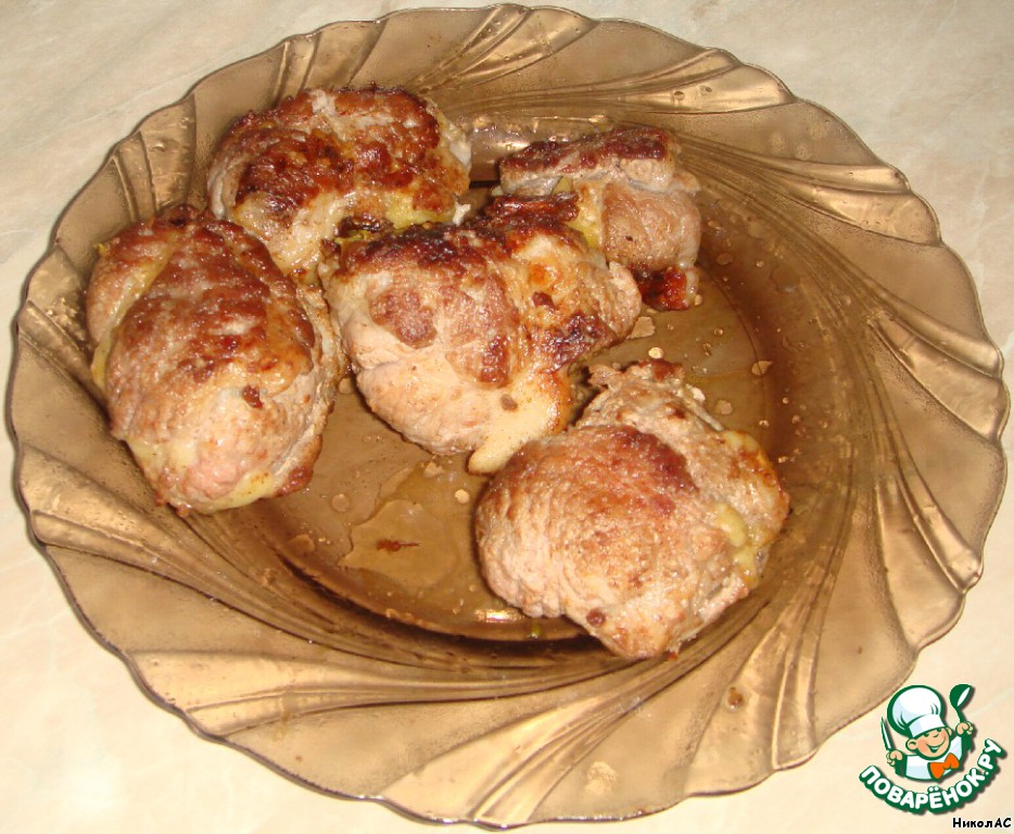 На получившийся конвертик кладем ломтик сыра и все это заворачиваем во вторую отбивную, перевязываем ниткой. -