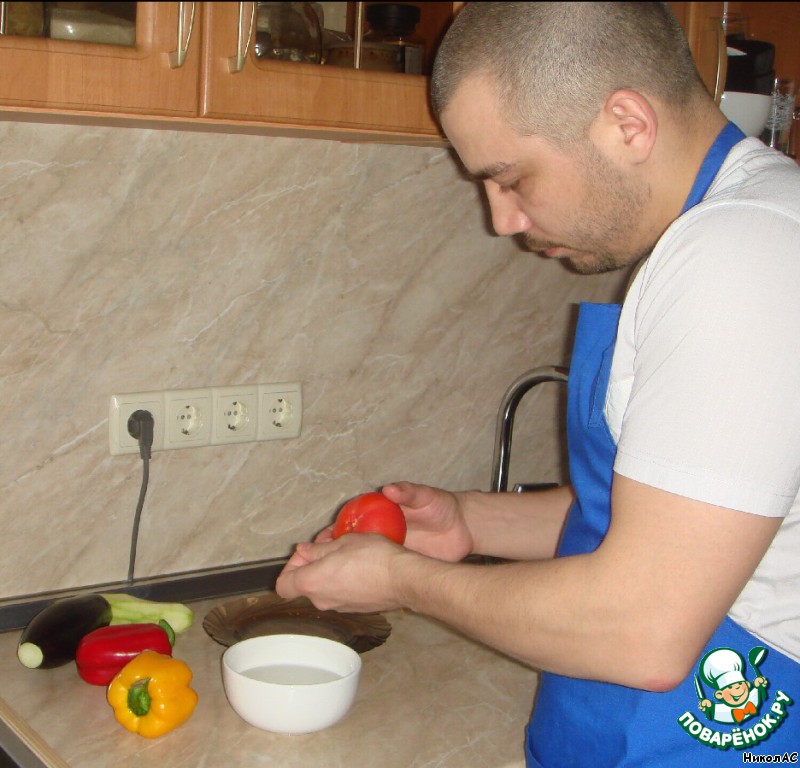 Заливаем кипятком на 1 мин. помидор и снимаем с него кожицу.