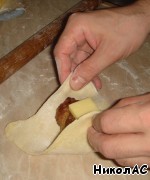 На тесто кладем конвертик и ломтик сыра.