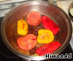Потом перец и помидор. Если помидор большой, то в конце лучше его немного притушить.