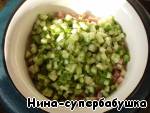 Добавить огурцы, нарезанные маленькими кубиками.